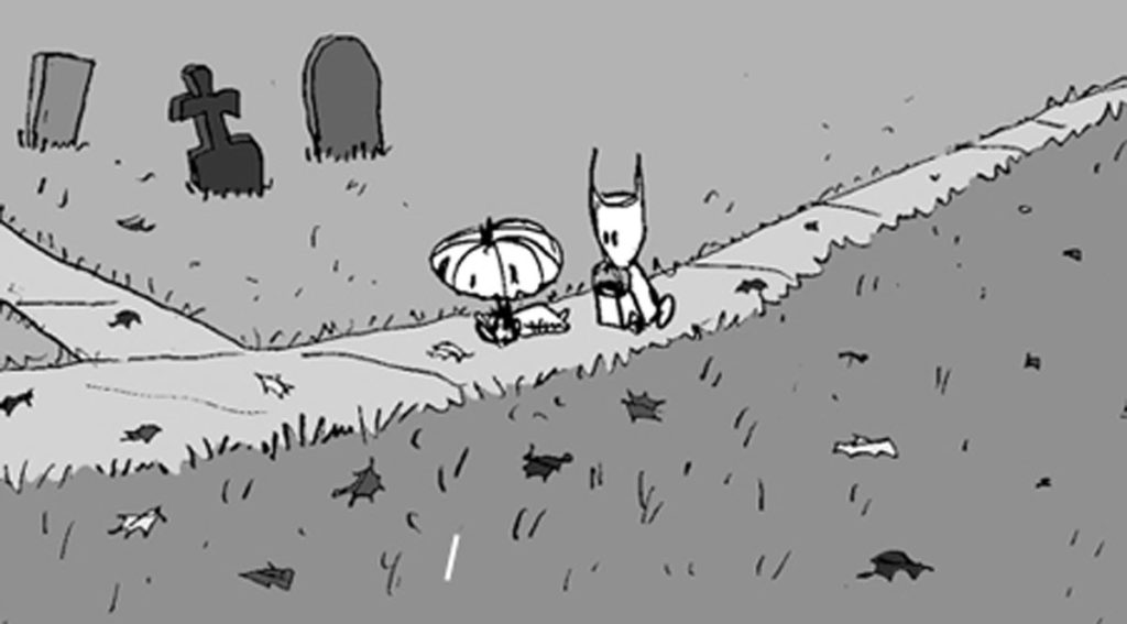 I don’t remember how or when I first stumbled upon the Pumpkinrot blog, I just know it’s been a number of years and one of my favorite features are the Begging for Candy webcomics. These single cell comics created by the mysterious persona known as “Pumpkinrot” capture the dark, but comedic conversations between two trick or treaters on Halloween night. Each comic is in a different setting and occasionally the styling of the artwork will change, but our two protagonists always remain. Obsessed with Bigfoot, the homeless, and full sized candy bars, one wears a jack-o-lantern mask and claims to be the “physical embodiment of Halloween,” the other wears a mask similar to Lock in Tim Burton’s The Nightmare Before Christmas. The comics began in 2012 and there have been over 200 entries. Below are my 20 favorite comics from the series.This slideshow requires JavaScript.You can check out the complete Begging For Candy series here.