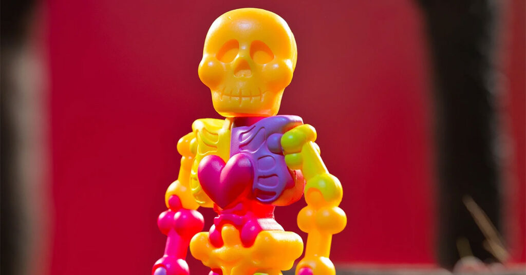 Super7 has debuted another take on the classic confection Mr. Bones with an all-new fluorescent variant of its Mr. Bones ReAction figure. Past releases have included a traditional figure as well as a glow-in-the-dark variant.(Image: Super7)This latest 3.75” articulated Mr. Bones ReAction Figure arrives in bright fluorescent colors inspired by the vintage puzzle candy treat and comes with a tombstone accessory. The figure is available for purchase now for $20 at Super7.com.Made by Fleer, Mr. Bones was a novelty puzzle candy first released in 1977. The candy was packaged in a plastic coffin filled with candy bones that you could connect, like a puzzle, to create a skeleton. The candy was discontinued in the mid-90s.