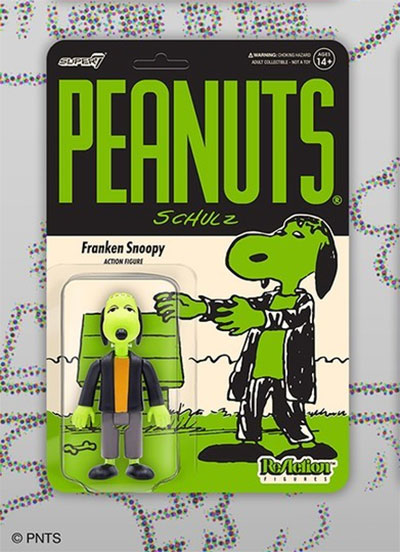 One of six new Snoopy figures, which will debut this spring, Franken Snoopy is inspired by the title cell of the 1964 comic strip where Charlie Brown, Snoopy, and Linus stay up to watch Frankenstein movies on TV and scare themselves to the point that each of them has to go to bed with a night-light. While originally not colorized, the Super7 release will feature Snoopy with a green skin tone and wearing a black coat, orange shirt, and grey slacks.