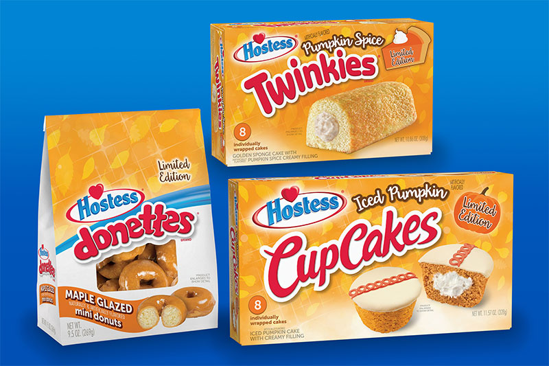 Each fall snack is available in a multipack, with Hostess Iced Pumpkin CupCakes and Hostess Maple Glazed Donettes also available in single-serve packages.