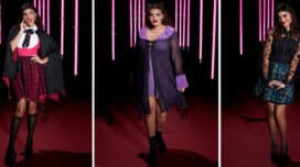 Available in sizes XS – 3X and plus sizes, this knit cropped sweater features a Fair Isle-inspired pater with icons from “The Nightmare Before Christmas” like Jack, Zero, and Oogie’s Boys. The look is completed with a large border stitch on the neckline and sleeves.