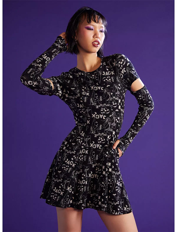 Available in sizes XS – 3X and plus sizes, this short-sleeve thermal dress features an allover print of Jack, Zero and other frightfully fun icons “The Nightmare Before Christmas.” The dress comes with removable matching arm warmers with thumb holes.