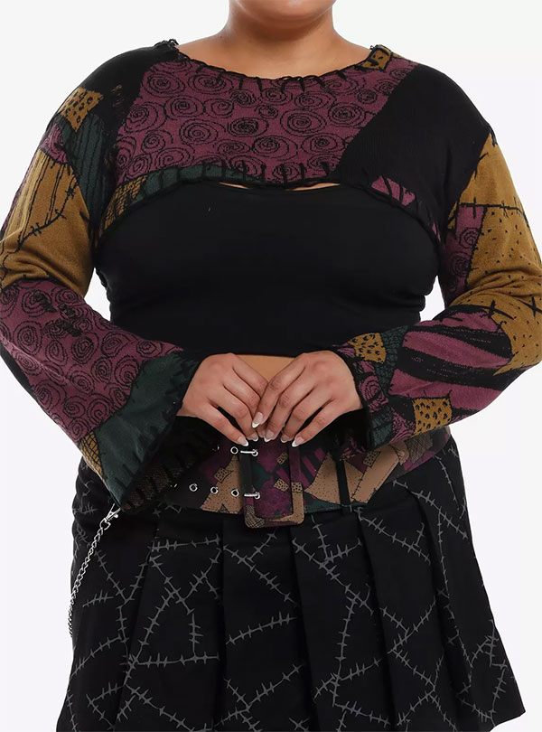 This extreme cropped shrug has an all-over stitch pattern inspired by Sally from “The Nightmare Before Christmas.” The look is completed with distressed detailing and large hand stitching on the bell sleeves and neckline. The top is available in sizes XS – 3X and plus sizes.