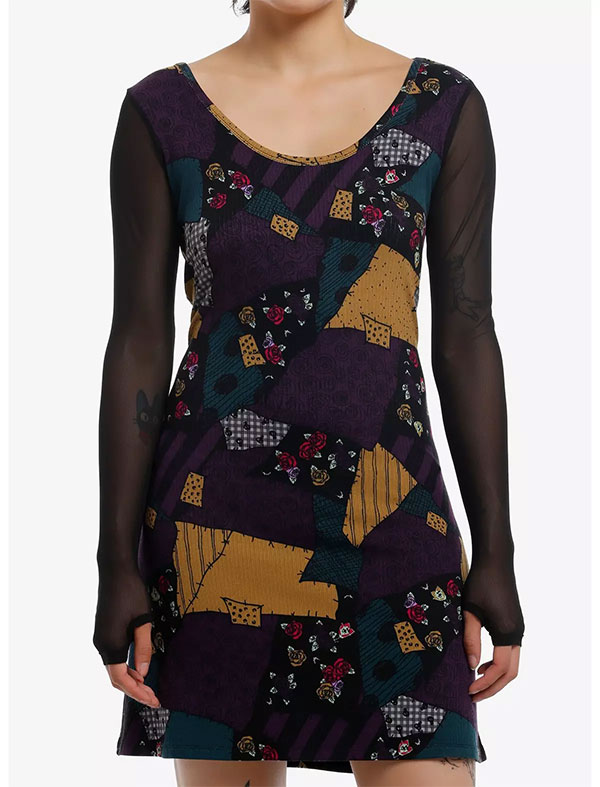 This dress features a patchwork design inspired by the character Sally from “The Nightmare Before Christmas” and comes with a scoop neckline and mesh long sleeves that have thumb holes. The dress is available in sizes XS – 3X.