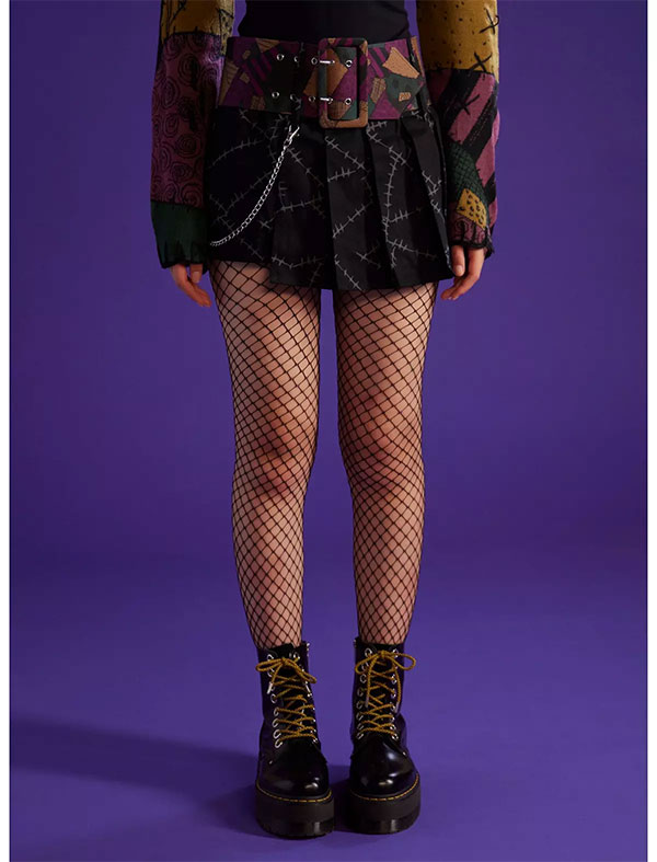 Available in sizes XS – 3X and plus sizes, this mini skirt features grey stitches inspired by Sally printed all over the pleated layer and an extra-wide grommet belt with Sally’s patchwork design.