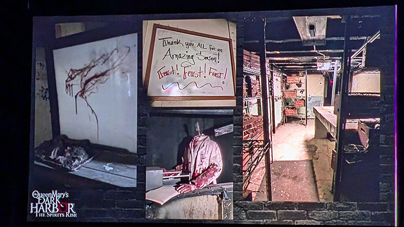 During the panel Bertolino shared that the legacy Dark Harbor character Chef was one of the few original Dark Harbor characters that fans didn’t really have an affinity for. However, in a weird twist of fate, his maze, Feast, happened to be the only maze aboard the ship to remain intact after it was assumed that all physical assets from past mazes had been lost. “When we started producing this event, we were told that all the mazes on the ship no longer existed,” explained Bertolino during the presentation. “And then, we got a call from Dylan, who runs events on the ship, and he said, I found something.” That something was the Feast maze, still tucked away deep within the ship like a haunt time capsule.